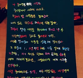 색깔 더보기 너의 울림 나를 울린 어제의 말들이온 몸을 돌고 돌아 오늘의 나를 다시 울린다. 네가 던진 어제의 진동이잦아들 새도 없이 오늘의 나를 뒤흔든다. 날아오던 화살은 하나도 기억나지 않고감정의 덩어리들만 고름처럼 온 몸에 남았다. 너의 진동, 너의 울림. 그래서 난 하루종일 둥둥거린다. 더보기 [그림책 이야기: 이미지와 텍스트] 3. 이미지와 텍스트의 연결고리 그림책 이야기: 이미지와 텍스트 (수업소개링크) 3회차 : 이미지와 텍스트의 연결고리 (2015.2.11) 1. 나눠준 텍스트 읽기 - 바다 무덤 (손택수), 나의 아름다운 방 (신영배), 오, 바틀비 (김소연), 아빠도 젖이 있다 (이안), 어느 늦은 저녁 나는 (한강), 먼지 (김언) 에서 부분 발췌한 텍스트들 2. 텍스트 중 마음에 드는 것을 하나 고른 후 / 선생님이 꺼낸 사물 두 개 중 하나를 골라 / 선택한 텍스트에 집중하여 그리기 * 내가 고른 텍스트 바다 무덤 / 손택수 중에서아내의 배 속에 있던 아기의 심장이 멎었다휴일이라 병원문이 열리길 기다리는 동안 식은 몸으로 이틀을 더 머물다 떠나는 아기를 위해아내는 혼자서 자장가를 불렀다 * 연습 도구: 만년필 3. 앞에서 고른 텍스트를 잊어버리.. 더보기 이전 1 2 3 4 5 6 ··· 20 다음